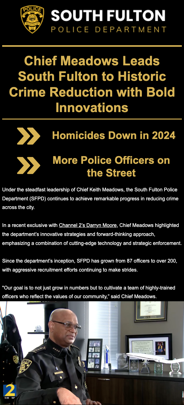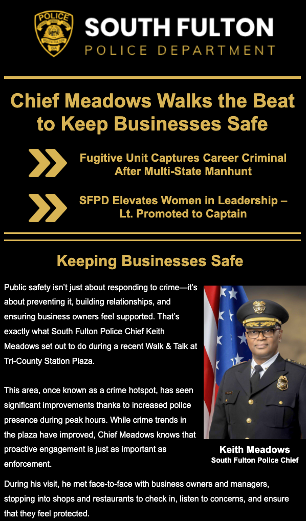 Strategic Content. Real Results. South Fulton Police Department Video Earned Media News Articles Metro Atlanta agencies helping families living in hotels this holiday seasonSouth Fulton police chief showcases technology used to fight crimeSouth Fulton Police Department program aims to improve lives of inner-city kids Social Media Content Newsletters Fine Fettle Earned Media Georgia veterans fighting for expanded access to medical cannabis Georgia DBHDD Brochures Outreach Behavioral Health Journalism Excellence Competition winner celebrated
